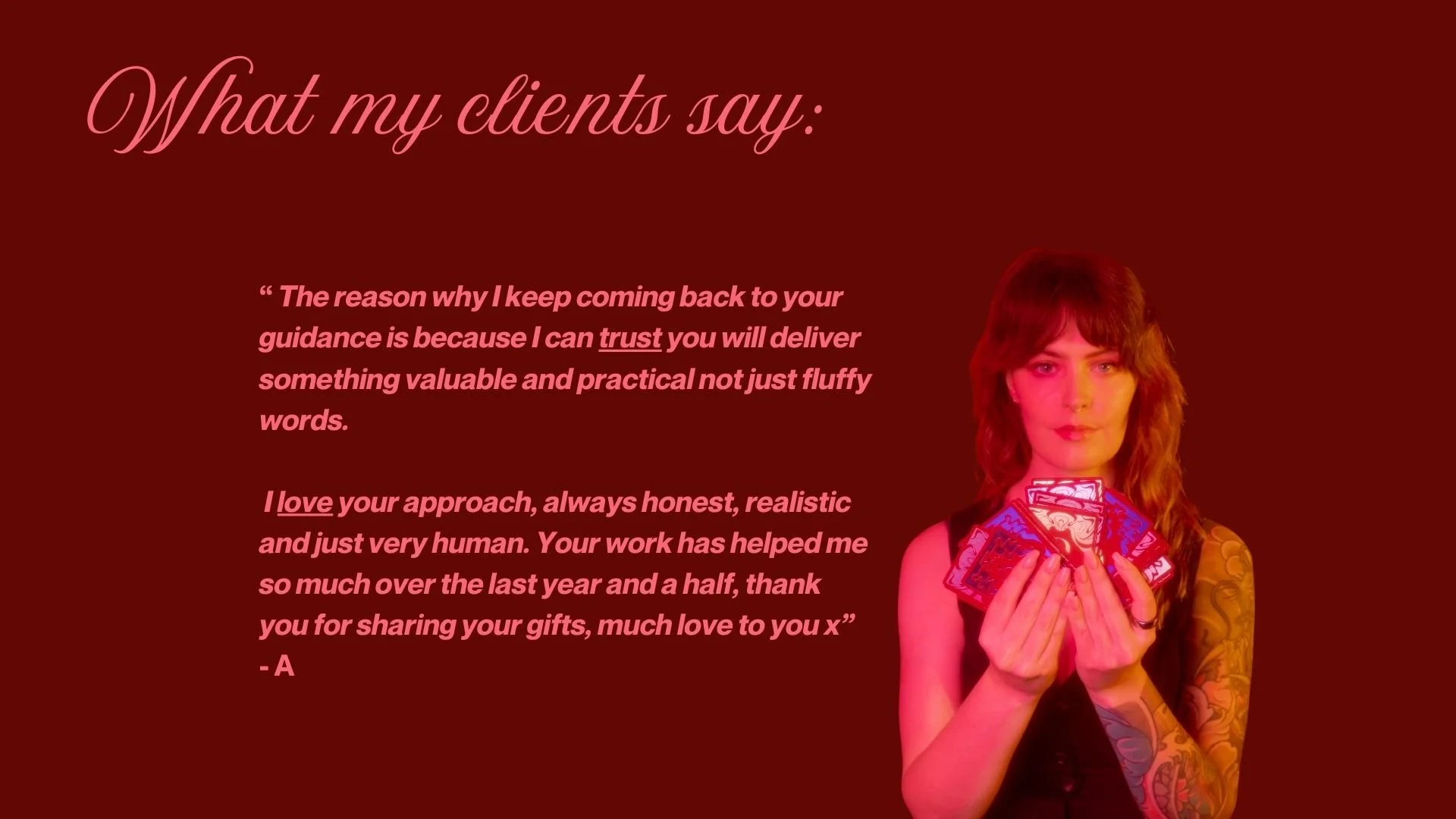 I consistently receive incredible testimonials, clients who work with me time and time again, and a soul-led desire to guide incredible women home to themselves. I work on my own shadows with a self-reflective practice and enter into mentorship myself to keep learning and growing. I’m not your Guru, just a guide.